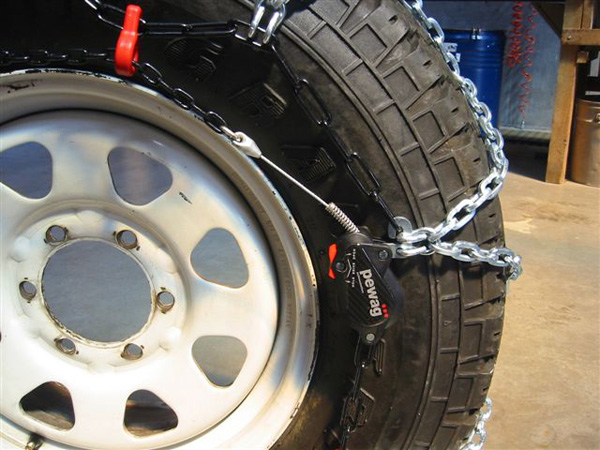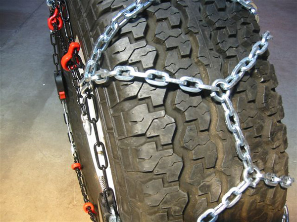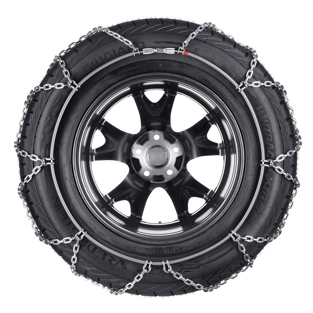 Łańcuchy wykonane są z ogniw 4.5 mm o przekroju kwadratowym. Nie wymagają najeżdżania w trakcie montażu. Optymalne dociąganie łańcuchów do opon gwarantują dwa automatyczne napinacze. Kabel wewnętrzny zapinany jest za pomocą zamka kulkowego. Zastosowanie plastikowych pierścieni dystansowych chroni aluminiowe felgi.